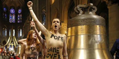 Pertengahan bulan ini Prancis tersentak dengan aksi bugil kelompok Femen di dalam Gereja Notre Dame. Mereka menuliskan tubuh mereka dengan slogan anti-agama dan Paus sudah tamat. Sambil memukul lonceng dengan tongkat mereka berteriak-teriak "Selamat Tinggal Benediktus!" dan "Tak Ada Lagi Homofobia!"